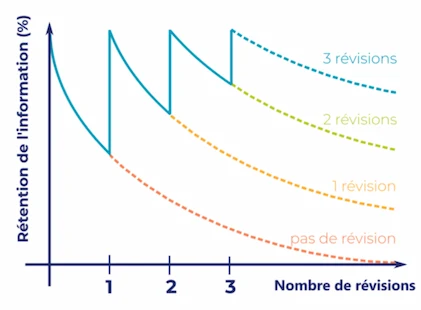 Ce graphique montre l'évolution normal d'un souvenir. À chaque révision ton souvenir persiste plus longtemps et sera de meilleure qualité. De plus chaque révision est de plus en plus courte.